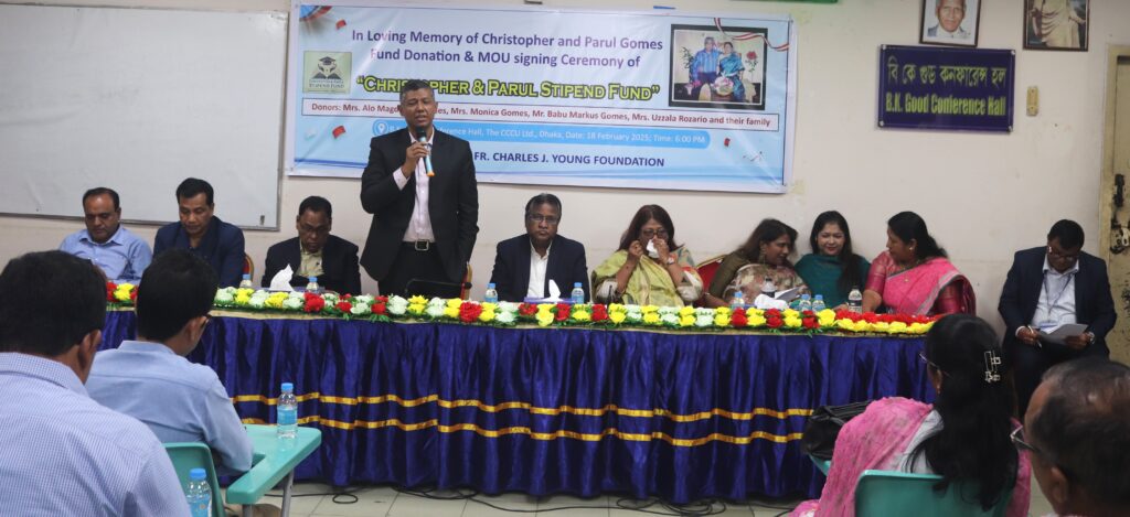 ১৮ ফেব্রæয়ারি, ২০২৫ ঢাকা ক্রেডিটের বি.কে গুড কনফারেন্স হল রুমে খ্রীষ্টফার ও পারুল ষ্টাইপেন্ড ফান্ড এক সমঝোতা চুক্তি সাক্ষরের মাধ্যমে ফাদার চার্লস জে. ইয়াং ফাউন্ডেশনকে ত্রিশ লক্ষ টাকার চেক সহায়তা প্রদান করে।