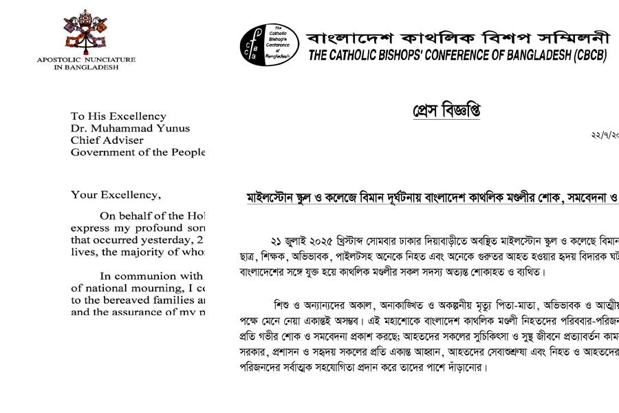 বাংলাদেশে বিমান দুর্ঘটনায় নিহতদের জন্য কাথলিক চার্চের শোক প্রকাশ