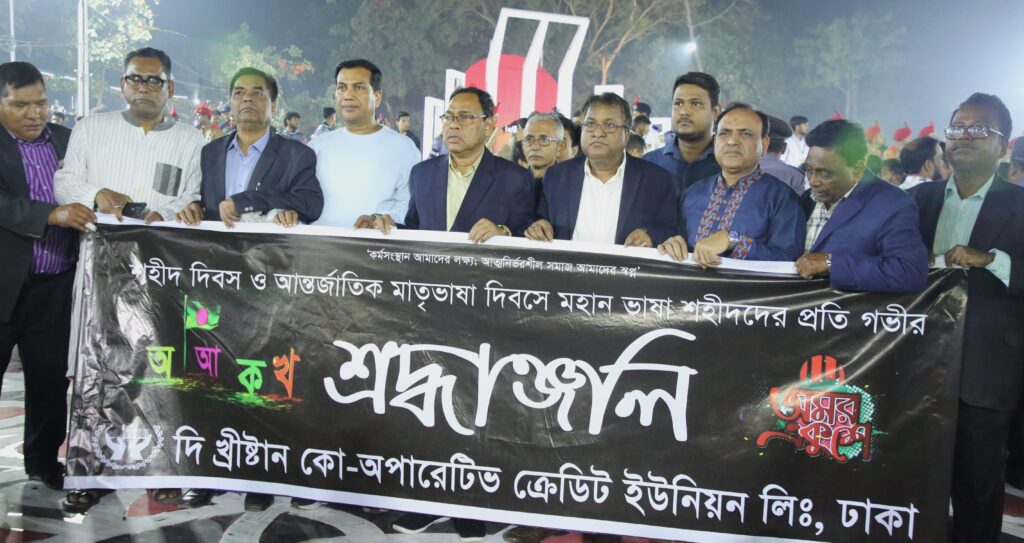 বাংলা ভাষা রক্ষার্থে প্রাণ হারানো শহীদদের প্রতি বিনম্র শ্রদ্ধা জানিয়েছে দেশ সেরা সমবায় প্রতিষ্ঠান দি খ্রীষ্টান কো-অপারেটিভ ক্রেডিট ইউনিয়ন লি:, ঢাকা (ঢাকা ক্রেডিট) ও বাংলাদেশ খ্রীষ্টান এসোসিয়েশনের (বিসিএ) নেতৃবৃন্দ।